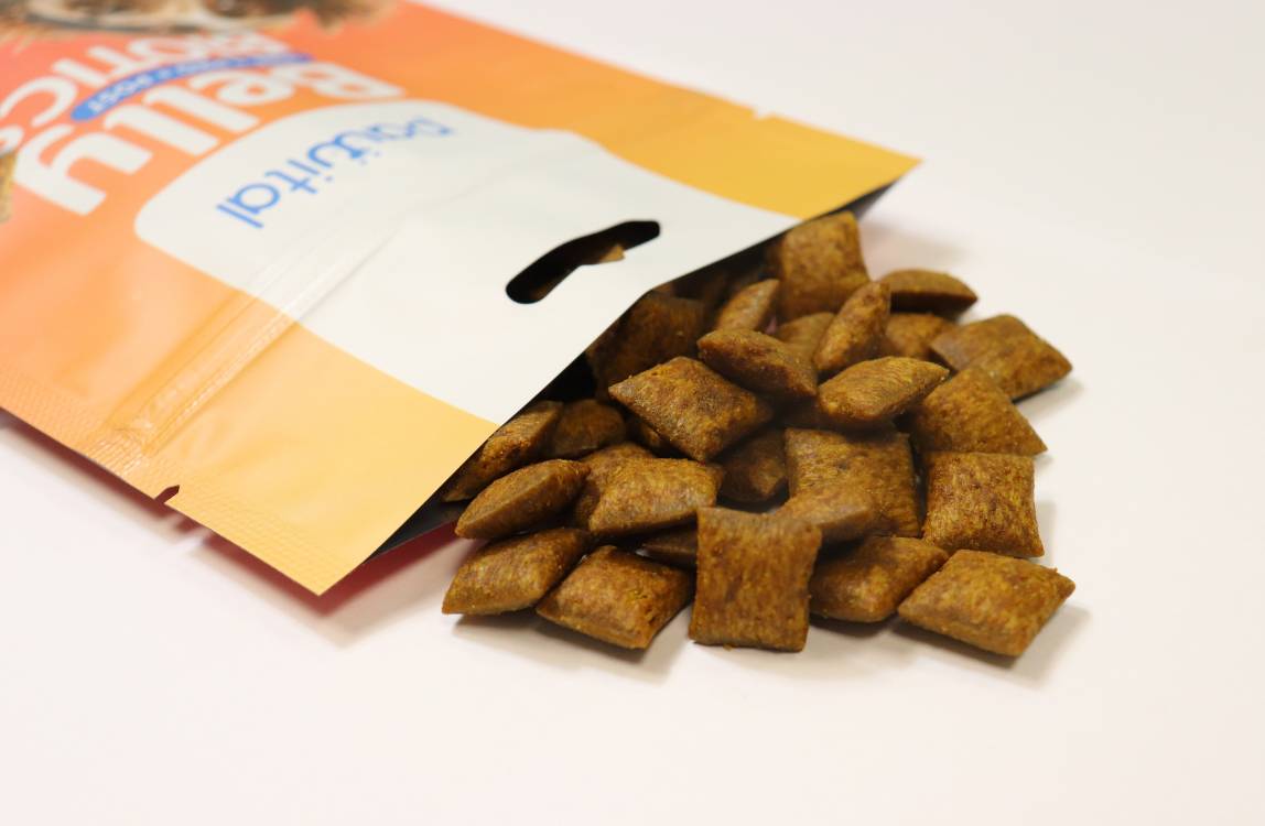 We use a special production method, where we first produce the treat and then later coat it with alive probiotics.